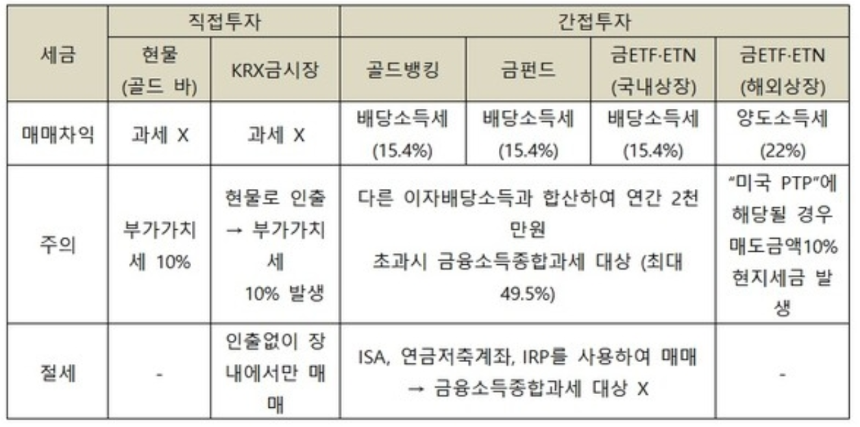 - 금 ETF 및 펀드: 매매차익의 15.4% 배당소득세 부과