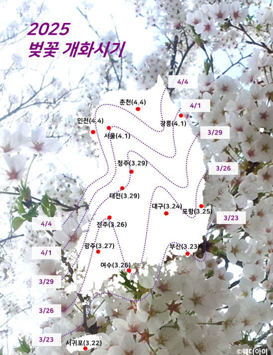 벚꽃은 3월 22일 서귀포를 시작으로 남부지방에 개화하기 시작했어요. 부산을 비롯한 남부 지방쪽은 3월 말, 3월 23~30일 부터 시작될 것으로 보입니다. 즉 4월 초가 부산 벚꽃 절정기가 될 것으로 보여요.