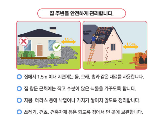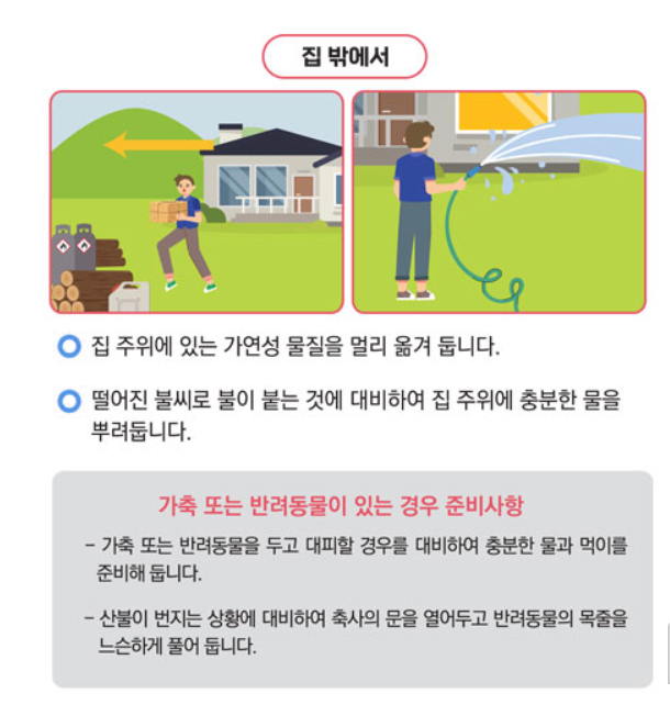 - 집 주변에 물을 충분히 뿌려 불씨를 막으세요.