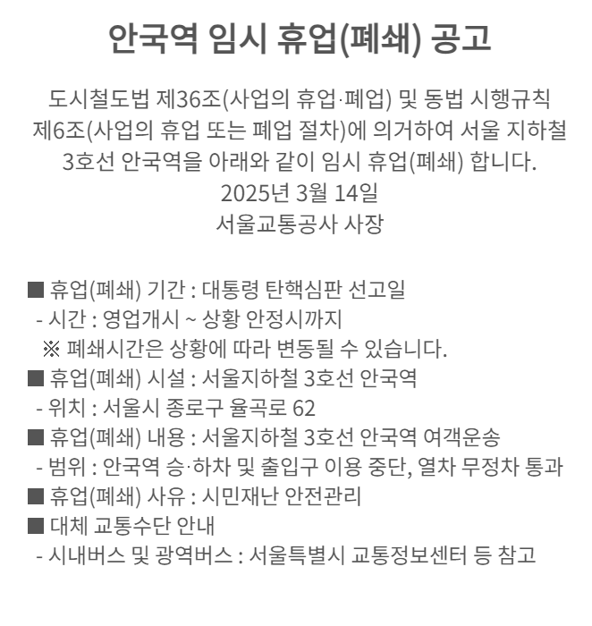 4월 4일 헌법재판소의 탄핵 심판 선고로 안국역 주변 지역의 교통이 크게 통제됩니다. 지하철 이용 계획이 있다면 반드시 사전 정보를 확인하고, 필요에 따라 대체 경로를 마련해두는 것이 좋습니다. 미리 준비하면 큰 불편을 피할 수 있습니다.